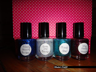 These are the ones i got from the Halloween collection and I received and extra polish for organizing the masses. She sent me a polish from the her current Funny Money collection Thank Blue! I love Lynnderella and her beautiful creations!!!